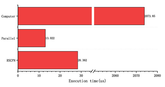 From the point of view of resources, the method of using computer processing takes up the most resources. The resource comparison between RSCPN and the traditional parallel method is as shown in Figure 18. The resources occupied by RSCPN are far less than the traditional parallel methods. LUTs only occupy 45.3%, FFs only 43.7%, BRAM only 37.5%, and DSP only 35.4%. Under the premise of meeting the execution time requirements, the more the same processing units, the more obvious the effect of this resource saving will be. Figure 19 shows the execution time when different methods perform the busiest multi-signal processing operation. Before the arrival of the next valid data (appearance time of the next data packet of SB1 and SB2: 51.2 us), both RSCPN and traditional parallel processing methods have completed the above operations, and the computer did not complete the execution until 2073.85 us. Therefore, both RSCPN and traditional parallel processing methods can meet the requirements of real-time signal processing.