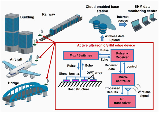 The raw ultrasonic signal is processed via edge-computing processes using the MCU. The raw ultrasonic signal is first processed by a finite impulse response (FIR) Band pass filter to remove power supply and system noises. The filtered ultrasonic signal is then rectified by obtaining absolute values of the filtered ultrasonic signal. Next, the rectified ultrasonic signal is enveloped and then decimated by a factor of 40 with an FIR filter to down sample the enveloped ultrasonic signal from 4000 number of data samples to 100 number of data samples. The decimated ultrasonic signal is then transmitted wirelessly to the host device through a ZigBee wireless link. The system repeats this process until the sequential ultrasonic scan process is completed. Thereafter, the edge-processed ultrasonic signals are uploaded to a cloud server for enabling active ultrasonic SHM applications. The active ultrasonic edge system is powered down and waits for the next sequential scan.