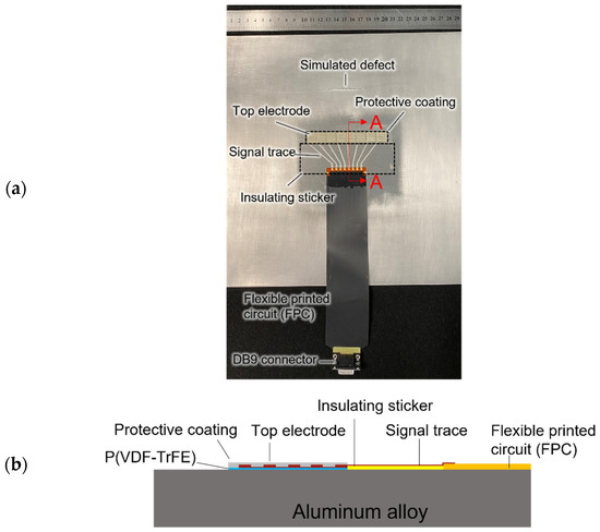 The in-house fabricated DWTs consist of a piezoelectric coating made of poly(vinylidene fluoride-trifluoroethylene) (P(VDF-TrFE)) copolymer, silver electrode, and a protective layer, as illustrated in Figure 2b. By using an aerosol spray coating system (Nordson in Westlake, OH, USA), the piezoelectric polymer coating with a thickness of about 13 μm was spray-coated on the aluminum alloy plate at 80 °C. The P(VDF-TrFE) coating was then annealed at 135 °C for 30 min by applying heat to the structure. Next, the P(VDF-TrFE) coating was poled by a noncontact corona discharge gun. A layer of insulating sticker was adhered next to the piezoelectric coating. This layer is for the direct-write signal traces, which connect the DWTs to a customized flexible printed circuit (FPC) with eight signal channels. The customized FPC was terminated to a D-Subminiature (DB9) connector, which was then be connected to the circuit for active ultrasonic edge computing. Thereafter, a sticker mask was used for deposition and patterning of the top silver electrode and signal traces, followed by curing at 70 °C. Finally, a protective coating made of epoxy adhesive (Araldite 2011) was applied on the DWT.