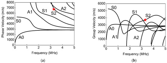 (a) Phase velocity and (b) group velocity dispersion curves for 1.6 mm-thick aluminum alloy plate. Here, A0, A1, and A2 are the antisymmetric Lamb wave modes; S0, S1, and S2 are the symmetric Lamb wave modes. The red star indicates the selected S2 mode at 3.2 MHz.