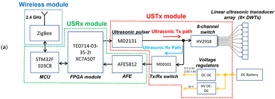 Our in-house designed active ultrasonic edge circuit is made of three modules: ultrasonic transmit (USTx) module, ultrasonic receive (USRx) module, and wireless module, as shown in Figure 4. The main component in the USTx module is an ultrasonic pulser chip (MD2131) for the generation of ultrasonic signals. The USTx module is connected to the linear ultrasonic transducer array. Channel selection for the linear transducer array is performed via an 8-channel high voltage analog switch (HV2918). An active transmit-receive (Tx/Rx) switch (MD0101, Microchip Technology in Chandler, AZ, USA) is used for preventing high voltage transmit pulses from entering the USRx module. An analogue front-end (AFE) integrated chip (AFE5812, Texas Instruments in Dallas, TX, USA) is used in the USRx module for digitization of the ultrasonic signals. The AFE5812 contains a programmable low-noise amplifier (LNA), and a 14-bit 40 MSPS analogue-to-digital converter (ADC). The edge-computing capability is enabled using an on-board microcontroller (MCU) (STM32F103, STMicroelectronics in Singapore) and a field-programmable gate array (FPGA) module (TE0714-03-35-2I XC7A50T, Trenz Electronics in Hüllhorst, Germany), which is equipped with a 50 K gates FPGA for controlling both ultrasonic pulser chip and the analogue front-end chip. In the edge computing circuit, the MCU acts as a master controller that can switch the entire system off to conserve energy when the scan is not being performed. The MCU is also used to control the wireless module (ZigBee, Chengdu Ebyte Electronic Technology in Sichuan, China). The entire ultrasonic edge system is powered by a 3.7–4.2 VDC battery, which powers up each module on-board. Appropriate voltage regulators are used to step-down and step-up the DC voltages for various modules. Load switch chips are used to implement power up and power down of modules in the edge circuit to optimize the power consumption.