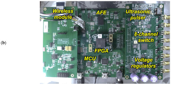 (a) Block diagram and (b) photo of the modules in the active ultrasonic SHM edge circuit.
