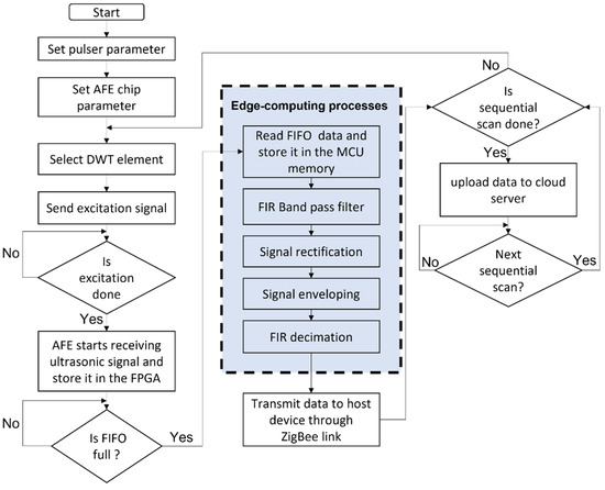 A flow chart describing the functionality of the developed active ultrasonic edge system, including edge-computing processes, is illustrated in Figure 5. The active ultrasonic edge system is configurable with a host device through the ZigBee wireless link. This host device can be remotely accessed from a SHM data monitoring center. Parameters for the ultrasonic pulser such as burst amplitude and frequency can be reconfigured when needed by programming the MCU. The ultrasonic pulser is set to generate a Hanning-windowed sine-wave excitation signal with peak-to-peak amplitude of ~80 Vpp and frequency of 3.2 MHz. Next, the MCU configures the AFE chip parameter with 40 MSPS and 14 bits/sample. Once the parameters are set, the MCU activates the corresponding DWT-element through switching the 8-channel high voltage analog switch. An excitation signal is then generated by the ultrasonic pulser and an ultrasonic wave is generated by the selected DWT-element. After the excitation is completed, AFE starts receiving the ultrasonic signals and stores in an array size of 4 K deep first-in first-out (FIFO) memory inside the FPGA. Once the FIFO memory is full, the MCU reads all the 4 K data and stores it in its internal memory.