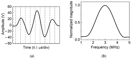 Excitation signal generated by the active ultrasonic SHM edge system: (a) time domain, with the vertical dashed lines indicating individual time divisions and (b) frequency domain.