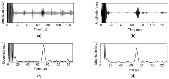 The ultrasonic signals detected by the DWTs were digitized by the AFE and stored in the FPGA, then later read by MCU to its internal memory. The ultrasonic signals were processed by the MCU following the edge-computing processes as described in Figure 5. As an example, the raw ultrasonic signal generated and detected by the 8th DWT element is presented in Figure 7a. In the band pass filtered ultrasonic signal, Figure 7b, the S2 mode reflected from edge of the plate can be observed at t = 71 µs. The large signals at t < 10 µs were produced by the electromagnetic interference (EMI). The filtered ultrasonic signals were then rectified and enveloped, as in Figure 7c, which is thereafter down sampled by factor of 40 using a decimating FIR filter, as in Figure 7d.