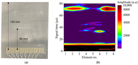For the operation demonstration, an aluminum alloy plate with the dimensions of 300 mm × 300 mm × 1.6 mm with a simulated defect with the dimensions of 45 mm × 2 mm × 1 mm is used, as shown in Figure 2a. A linear ultrasonic transducer array comprising eight DWTs is implemented.