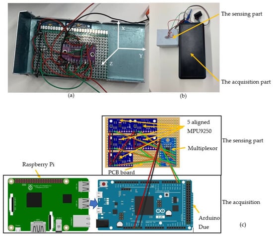 A PCB board: a Printed Circuit Board (PCB) was used to place the sensors in the targeted location with all their axes aligned. The sensors used the shortest possible wire lengths for connections between the multiplexor the accelerometers. In Figure 1a, the adjustment of sensors on LARA by the PCB is shown. In fact, it can be seen in Figure 1a,c that the PCB board has aligned x, y, and z axes of the MPU9250 accelerometers.
