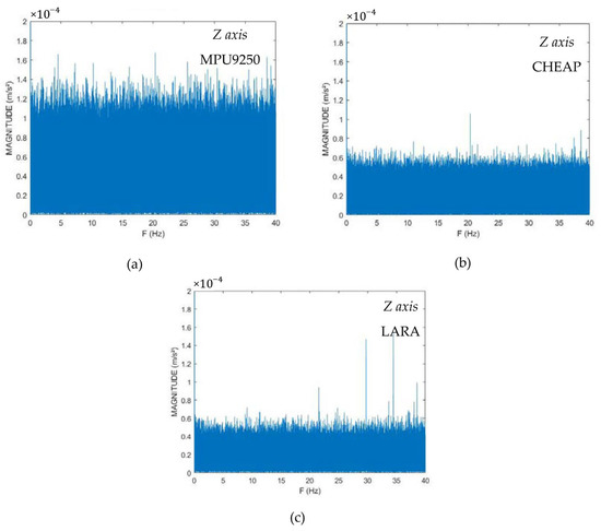 Frequency domain diagrams for z axis of: (a) MPU9250, (b) CHEAP, and (c) LARA.