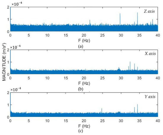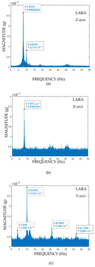 Analysis of Figure 2 shows that while LARA and CHEAP resolution are almost equal, the resolution of a single MPU9250 is almost twice as the CHEAP or LARA. By studying Figure 2, MPU 9250’s resolution, CHEAP and LARA for the z-axis are reported as 0.00016 m/s2, 0.00009, and 0.00009, respectively. It is to be considered that this test needed a long duration of data capture; consequently, it was done in an office at midnight. The FFT method reports more accurate outputs when it has a higher number of inputs [60]. For a fair comparison between MPU 9250, CHEAP, and LARA, the same number of data had to be evaluated by the FFT method. Although sampling two million sets of data took MPU9250 and CHEAP 6.5 h, LARA acquired two million sets of data in about 1.7 h. Figure 3 shows the frequency domain diagrams of acquired data of LARA for all the axes.