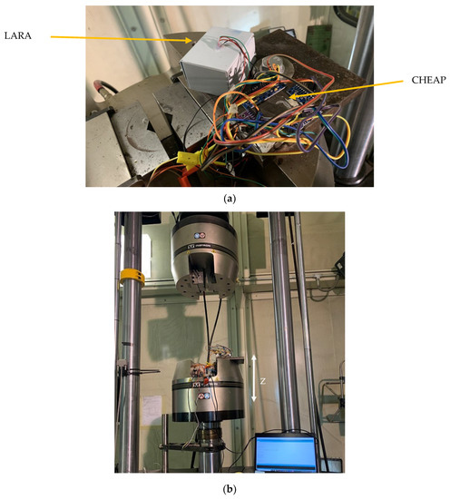 Laboratory validation of LARA: (a) mounting CHEAP and LARA to the shaking part of the jack, and (b) the used vibrating platform (INSTRON 8803).