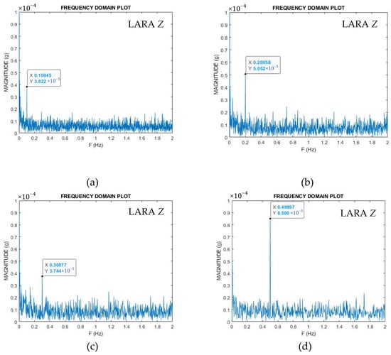 It can be seen from Figure 4 that both CHEAP and LARA are attached to a rigid metal plate. This attachment was carried out by using an industrial adhesive (X60). X60 made by HBM company, is a two-component methyl-methacrylate adhesive that is widely used for accelerometer mounting [66]. Moreover, the metal plate containing CHEAP and LARA is bolted to the shaking table. For validating the accelerometers’ accuracy, 11 tests with various frequency ranges (from 0.1 Hz to 32 Hz) were performed. For finding the frequency report of the accelerometers, the accelerometers’ time-domain raw data were converted to the frequency domain by an FFT program written in the MATLAB software. To show the methodology of the calculation of the accelerometer’s frequency errors from the jack’s results, four frequency domain plots of LARA for 0.1 Hz (Figure 5a), 0.2 Hz (Figure 5b), 0.3 Hz (Figure 5c), and 0.5 Hz (Figure 5d) are presented in Figure 5.