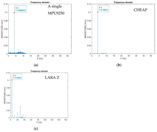 Further investigation of Table 3 illustrates that MPU9250, CHEAP, and LARA have similar errors for signals with frequencies bigger than 2 Hz, but the error is still not 0.000%. In fact, the FFT evaluation can be influenced by irregularities, such as the number of sampled data and the sampling frequency speed [60]. However, controlling all the data for such accuracy is not the aim of this paper.