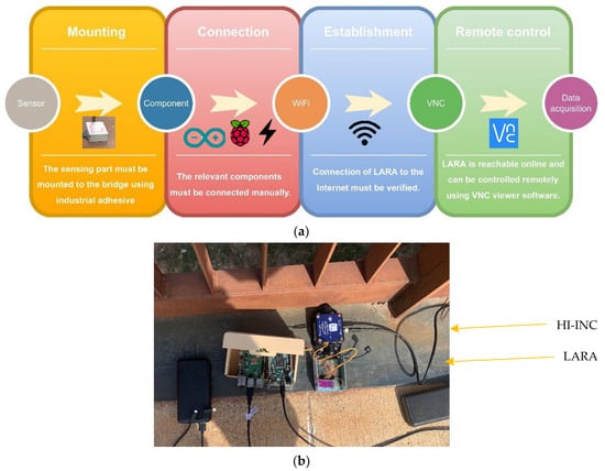 A Raspberry Pi: Raspberry Pi is a small size Linux-based computer that can be connected to Arduino microcontrollers. This way, the operator can access the Arduino codes for modifying or upgrading purposes. To save and acquire provided data of the accelerometers, a python code was written to save the acquisition data on the Raspberry Pi memory card. For synchronizing different LARAs for future SHM applications, the Arduino’s acquired data were saved with an accurate timestamp. The timestamp is reported from the inner clock of the Raspberry Pi. For constantly synchronizing the inner clock of the Raspberry Pi with the accurate time of the Internet, the Raspberry Pi’s NTP protocol was activated. Figure 1c shows the connection between the Arduino and the Raspberry Pi. Arduino gets its needed power from a USB port of the Raspberry Pi. Raspberry Pi can be powered up by using an adaptor or a power bank. It is also noteworthy to mention that the time keeping accuracy when using a Raspberry Pi model 3b+ with a NTP server was already published in the literature [48]. In this work, an overall deviation of 0.01 s was measured after a 40 h test. This value corresponds to a time accuracy of 0.07 Parts Per Million (PPM).