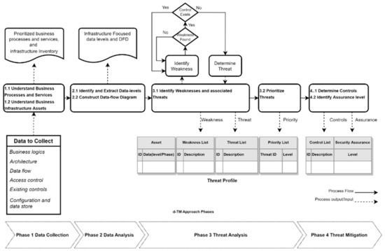 The process methodolgy used to analyse threats comprises of the following four main phases: data collection, data analysis, threat analysis, and threat mitigation. These phases consider d-TM concepts and it is worth mentioning that these phases are sequential and are necessary to identify, assess and manage the threats. Figure 2 represents an overview of the d-TM approach including requirements, stages and outcomes. The initial two phases provide the necessary knowledge of the business processes, services, and assets so that DFD can be generated to demonstrate the data flow in various phases. The threat analysis phase follows, in which assets and identified data are evaluated for weaknesses and related threats. Furthermore, discovered threats are prioritised in order to determine their threat criticality to business data. The last phase attempts to offer appropriate controls to reduce prioritised threats. The proposed controls are assessed for their security resilience in cloud-based computing organisations.