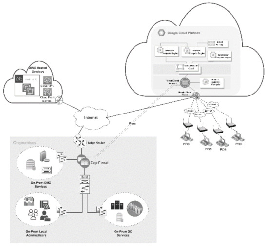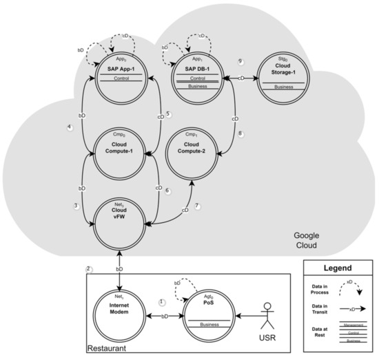 Figure 4, represents the business service (Bs0) data flow diagram, that shows a business user using a PoS machine to access the sales operation application that is hosted in the cloud. The figure shows that when the sales person uses web browser at PoS machine to access cloud hosted services, the data traverse over multiple assets to the final destination. The figure shows that the data levels and phases at each asset facilitate sales operation application.