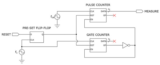 The generic structure of a frequency counter is shown in Figure 2. When the device is enabled (RESET = ‘0’), the gate and the pulse counters start counting, respectively, with frequency and , until the gate counter reaches the overflow condition (OF = ‘1’). The overflow disables the counters, providing as output (MEASURE) the count reached by the pulse counter.