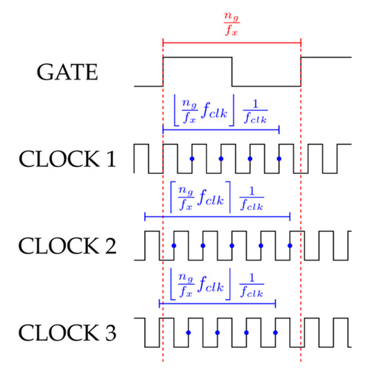 In (13) we stated that the frequency meter output is a count value corresponding to the floor of the product between the measurement time and the clock frequency ; however, this statement is true only when the gate and the clock signals are initially in phase, i.e., if the measurement window starts with a rising edge of both the input and the clock signals; in this way, each clock count corresponds to a period equal to . Conversely, if the two signals are not in phase, i.e., the first clock rising edge is delayed with respect to the measurement start instant, the first clock count occurs after a time shorter than , although the frequency meter interprets it as a whole clock period; as a consequence, if the clock delay is smaller than the fractional part of times (the truncation error, i.e., ), the resulting frequency meter output count becomes the ceil of ; this effect is depicted by the three examples shown in Figure 4.