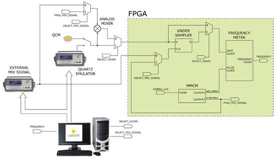A condition of this kind can be achieved by performing proper preprocessing operations on the input signal before executing the frequency measurement. A possible approach to pass from the original QCM resonance frequency to a frequency value granting the desired measurement resolution is to down-shift the frequency of the QCM signal by mixing it with a signal with an appropriate frequency to reach the frequency band indicated in (31); this mixing operation can be performed in two ways: