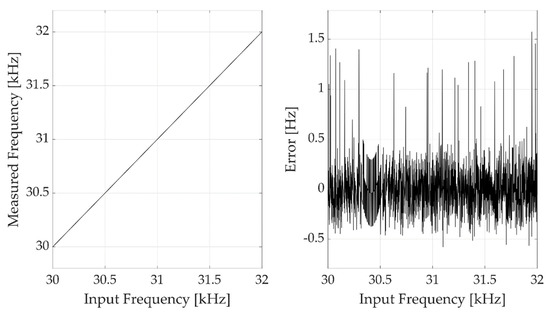 Figure 9 shows the experimental error obtained by averaging the output of 100 repeated measurements for each input frequency. The number of averaged measurements is considered acceptable in the context of a QCM-D measurement technique, assuming to interrogate the quartz with a frequency of 100 Hz, i.e., a transient excited with a pulse repetition frequency (PRF) of 100 Hz, and to provide an estimation of the resonant frequency each second; this measurement time is reasonable for QCM-based monitoring in most applications where the system under test transients are usually in the tens of seconds or in the minutes ranges (e.g., bacterial growth, gas adsorption, film growth).