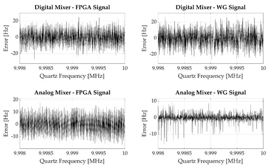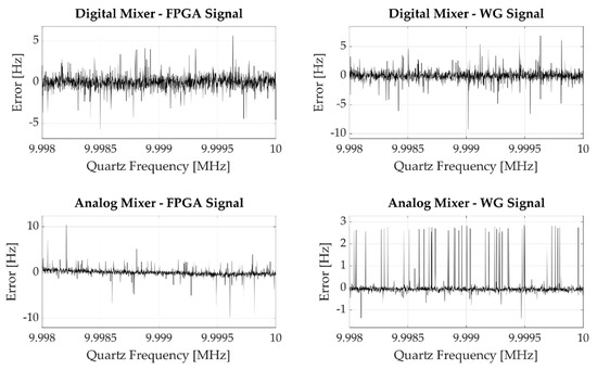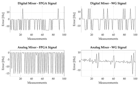 Experimental error observed while performing 100 measurements for each generated frequency. The four plots show the results obtained mixing the input signal using the digital or the analog mixer along with the signal generated by the FPGA or by the waveform generator.