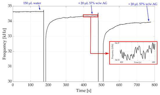 The presented system was used to monitor the QCM series resonating frequency in liquid. We started from pure water (150 L) and then we added, with a micropipette, subsequent doses of 20 L of a solution of water with 57% weight/weight (w/w) concentration of anhydrous glucose, obtaining solutions with anhydrous glucose w/w concentrations of 0%, 9.11% and 15.71%, corresponding to heavily loaded damped responses of the QCM, as they correspond to values of the resistance up to 210 [2,48]; the observed frequency variations are reported in Figure 11.