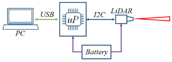 The basic diagram of the model is presented in Figure 2. A battery is used to power both a V3-Lite LiDAR sensor and an Atmega2560 microprocessor board that reads the information from the sensor via an I2C communication protocol.