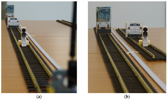 Fake targets used for indoor testing of long-range LiDAR.: (a) pedestrian model and/or car model placed between the tram equipped with sensor and the tram target; (b) pedestrian model and/or car model placed on the lateral line from the tram equipped with sensor and the tram target.
