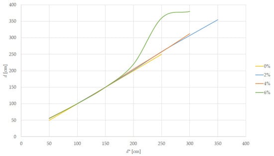 For this experiment, we prepared the track using pillars and we placed the tramcar target, as computed in Equations (2) and (3), at increasing distances, d*, with the result shown in Table 5 for a tramcar target and Table 6 for a car target. Figure 11 is presenting the measured value versus the target’s frontal displacement when the target is moved uphill. Those measurements are influenced by the height between the LiDAR sensor and the track, as computed in Equation (8).