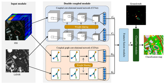 In summary, the nature of the data captured by different sensors is entirely different, which raises a severe challenge to the effective processing of multi-source remote sensing data [29]. However, it is still a problematic issue to design an effective deep classification model for multimodal data. In this paper, a hyperspectral and LiDAR data classification method based on a dual-coupled CNN-GCN structure (DCCG) is proposed. The model employs two sets of networks with similar structures for structure-level fusion, which can be divided into two parts: a coupled CNN and a coupled GCN. The former utilizes a weight-sharing mechanism to structurally fuse and simplify the dual CNN model and to extract spatial features from hyperspectral and LiDAR images, respectively. The latter first concatenates the HS and LiDAR data for constructing a uniform graph structure. Then, the dual GCN models perform structural fusion by sharing the graph structures and weight matrices of some layers to extract their structural information, respectively. Finally, the final hybrid features are fed into a standard classifier for the pixel-level classification task under a unified feature fusion module. The main contributions can be summarized as follows: