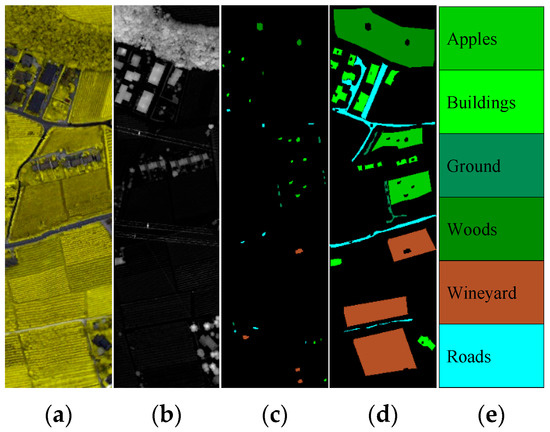 Figure 4. Visualization of Trento dataset: (a) false-color image (using 50, 45 and 5 bands as R, G and B, respectively); (b) LiDAR image; (c) training samples; (d) test samples; (e) color code.