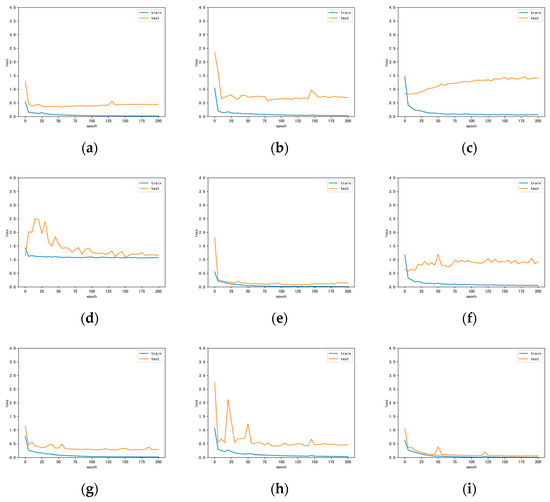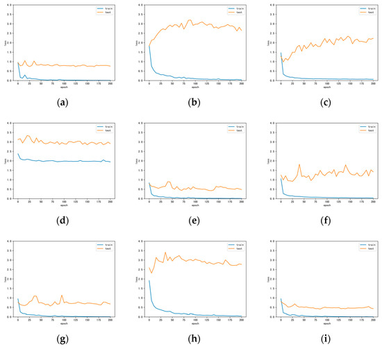 Loss curves obtained by different methods for the Houston dataset. (a) CNN-H; (b) CNN-L; (c) miniGCN-H; (d) miniGCN-L; (e) CCNet-HL; (f) CGNet-HL; (g) DCCGNet-H; (h) DCCGNet-L; (i) DCCG-HL.