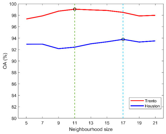 In the proposed model, one parameter (i.e., neighborhood size ) needs to be determined in advance before training. We fixed the basic structure and main parameters of the network, picked the neighborhood size from the candidate set {5,7,9,11,13,15,17,19,21} in turn, and tested the overall accuracy variation of the network. Figure 10 illustrates the effect of different neighborhood sizes on the classification accuracy of the Trento and Houston data, respectively. A similar phenomenon can be observed in the figure, where the OA first rises significantly and then slowly decreases as the neighborhood size increases. Specifically, the model achieves the highest classification accuracy of 99.06% on Trento data when . Correspondingly, the model also achieves the highest classification accuracy of 93.79% on Houston data when .