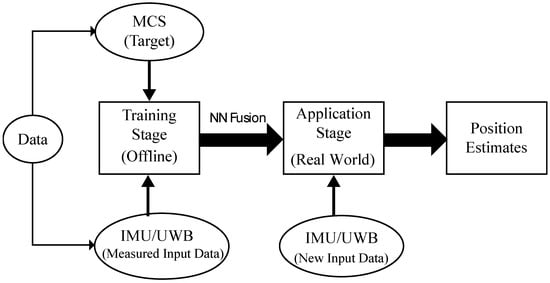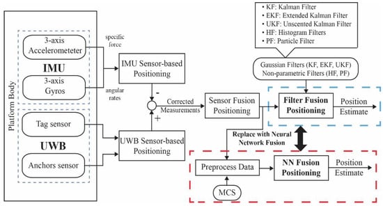Indeed, improving the accuracy of IMU-based systems has been investigated based on their combined use with other sensors or technology. One method involves combining an IMU with magnetometers [,]; however, it is not widely used because large magnetic fluctuations exist in indoor environments that affect measurements, although better calibration techniques are being developed []. Furthermore, more complicated sensors, including light detection and ranging (LIDAR), have been utilized to provide heading corrections, which can effectively reduce errors []. Other common techniques include hyper-algorithms based on suitable sensor fusion, which have been found to be the most effective solutions for positioning systems to achieve sufficient accuracy. Such fusion techniques using IMU and TOF measurements from UWB systems have the advantage of accurately deriving useful information related to the position compared to other methods because they combine the features of different mechanisms to enhance performance [,]. This is where the fused UWB system and IMUs can assist in eliminating noise and enhancing the measurements. However, when considering a large range of different dynamic and static rotational and translational motions, the attainable accuracy is limited by the need for situation-dependent adjustment of the accelerometer and gyroscope fusion weights []. Hence, we introduce a fusion technique using an ANN with fusion data of IMU/UWB with MCS to increase position accuracy and overcome the aforementioned issues. Figure 2 illustrates the proposed sensor fusion workflow for position estimation. In many applications, IMU-based UWBs are employed to estimate the positions of indoor environments in real time. Commonly used sensor fusion filters may be outperformed, but still suffer from noise and outlier measurements, as previously discussed. Therefore, a fusion technique using an ANN has been proposed and replaced with traditional fusion filters.