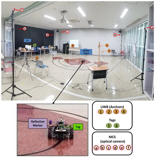 Similarly, in OptiT-MCS, six optical cameras (a, b, c, d, e, and f) were distributed at different known positions to detect the reflective marker position (g). One Tag/IMU (6) and one retroreflective marker (g) were placed on the mobile robot using a wood holder for positioning data. One more Tag/IMU (5) was used as a master tag, which connected to the PC to collect positioning data from Tag (6) and to communicate with the anchors. Simultaneously, real-time 3D position data were collected from both IMU/UWB and OptiT-MCS-based robot movements at a constant speed. The sampling rates were 11 Hz for UWB and 50 Hz for OptiT-MCS; later, the data measurements were synchronized.