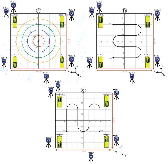 The proposed system was validated in three experiments with a diverse set of motion recordings inside the testing area (5 m × 5 m) to ensure the generalization of recording data with a high coverage of the proposed test area. One experiment imitated a circular movement, and the second and third represented random movements on the Y-axis and X-axis, respectively, as indicated in Figure 4. The positioning calibration of shape (a) in Experiment 1 was repeated using a mobile robot with different diameters of 0.5, 1.0, 1.5, and 2 m. Thus, four circles with 30 trials each were executed, with 120 trials of circular data recording motion. Subsequently, shapes (b) and (c) were implemented with 15 trials each, totaling 30 trials of random data recording motion. In total, 150 trials of positioning data were collected from both the IMU/UWB and OptiT-MCS.