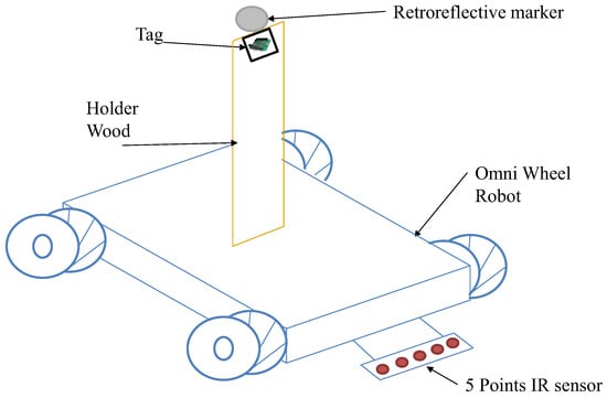 Omni wheels mobile robot attached with Tag/IMU and passive retroreflective marker.
