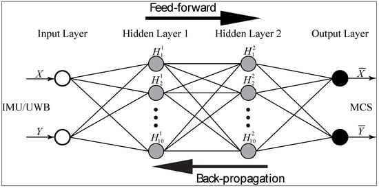 With the collected data (150 experimental trials) from IMU/UWB and MCS, an ANN fusion was built using the Neural Network Toolbox of MATLAB. Figure 6 illustrates a four-layer neural network implemented based on the Levenberg–Marquardt backpropagation (LMBP) method []. The input layer receives the 2 row position values (X and Y) of the IMU/UWB sensor, while each hidden layer has 10 neurons (H1-H10) with a tangent sigmoidal hyperbolic as the activation function as shown in Equation (1). The output layer has two neurons with a linear activation function as shown in Equation (2) []. The outputs ( and ) are row position values of the MCS sensor that represents the target position values of the input data. A trial and error approach was used to determine the parameters of the ANN (number of neurons in the hidden layer and activation functions) after multiple tests []. In this research method, the design of the network architecture was determined to achieve the simplest ANN structure along with the least output error. The input and output data were normalized using the Min–Max [] method in MATLAB, where the acquired data were randomly divided into the following three sets to avoid any bias: training 70%, validation 15%, and testing 15%.