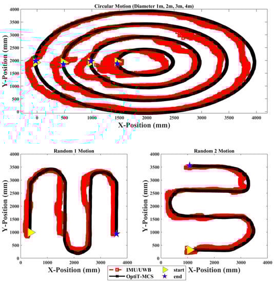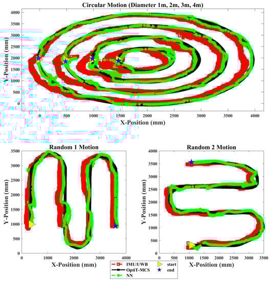 Figure 7 illustrates the trajectory position estimated using the mobile robot in the X-Y coordinates by IMU/UWB and OptiT-MCS for 150 trials in three types of experiments. The right-pointing triangle represents the start point of the mobile robot tracking, whereas the pentagram represents the end point of the path or destination points. The results of calibration indicate that the positional error of the IMU/UWB deviated along the path, and it was impossible to obtain an accurate measurement of the initial start point (right-pointing triangle) under an increasing error owing to the processing duration and USB communication delay between both tags and anchor devices, which is not instantaneous. Furthermore, the mobile robot was carefully controlled to move in a constant speed with low vibration to ensure the high reliability and robustness of a diverse set of motion recordings, but the rigid drives and joints negatively affect the measured data along the path. Thus, the trajectory obtained from the IMU/UWB system presented an average error of 24.2 cm with regard to the OptiT-MCS (millimeter average error) path for all data measurements. In addition, when a large range of different dynamic and static rotational and translational motions is considered, as in our implemented experiments, the attainable position accuracy is limited and the NN fusion model is required to overcome this issue.