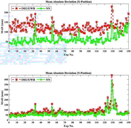 For a visual representation of the position accuracy during the entire experimental process, Figure 9 depicts the position estimation accuracy in millimeters in terms of MAD for 150 experimental trials. From this figure, it can be observed that there is a significant enhancement in the prediction accuracy of the proposed fusion NN model compared to the IMU/UWB system, which is 79.71 mm for the best case in the X coordinate and 89.97 mm for the worst case in the Y coordinate. Furthermore, the proposed fusion NN model performed better in the X-and Y-coordinates in circular motion (Exp. 1~120) compared to random motion (Exp. 121~150) and better than 40.77% and 16.94% positioning accuracy improvements in circular and random motions, respectively, over the IMU/UWB system. Ultimately, the positioning accuracy improvement can be further realized in either the X or Y coordinates by both IMU/UWB and NN systems in Random 2 motion (Exp. 136~150) compared with Random 1 motion (Exp. 121~135).