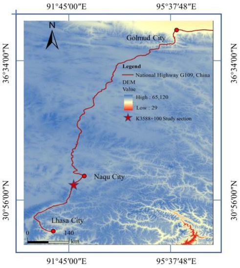 The subgrade section to be researched in this paper was taken from the Golmud-Naqu highway, which is a part of China National Highway G109 connecting Beijing and Lhasa. It is located in Xiangmao Township (31°02′ N, 91°68′ E), Seni District, Naqu City, pile No. K3588 + 100, and the subgrade soil is mainly sandy soil. The location of section K3588 + 100 is shown in Figure 1. The area belongs to the plateau sub-cold semi-arid monsoon climate zone, with high terrain in the west and low terrain in the east. The elevation is between 3800–4500 m, with an average of about 4100 m. As a result of its high altitude, it suffers from a lack of heat and a harsh, arid climate. The annual average temperature is −2.2 °C, the annual relative humidity is 49%, the annual precipitation is 380 mm, and the annual sunshine hours are more than 2852 h.