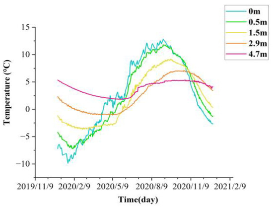 The time series data were acquired through temperature sensors, volumetric water content sensors, and frost heave sensors deployed in the study area, the detailed study section layout is shown in Figure 2. In Figure 2, ①–⑤ are shown as the left foot of slope, left shoulder, roadbed median, right shoulder, and right foot of slope of the study section, respectively. The data duration is from 1 January 2020 to 31 December 2021, and the variation of temperature time-history at different depths of the right shoulder of section K3588 + 100 is shown in Figure 3.