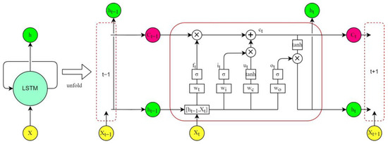 Long short-term memory (LSTM) network is a special variant of recurrent neural networks (RNN) [22]. In traditional feedforward neural networks, information can only flow from the input layer to the hidden layer, and finally from one direction to the output layer. The main distinction between RNNs and feedforward neural networks is that RNNs have a recurrent cell to store the historical state of all past elements in the sequence [42,43]. However, when training an RNN model with the gradient descent method (usually used to train feedforward neural networks), the gradient may increase or decrease exponentially, which can cause the gradient to vanish or explode. If the gradient vanishes during the training process, the weights cannot be updated, which eventually leads to training failure. On the contrary, exploding gradients that are too large will drastically update network parameters, and, in extreme cases, can lead to erroneous results [44]. LSTM improved RNN by introducing the concepts of gates, and of applying memory cells to filter and process historical states and information instead of the recurrent cells of RNN. The basic structure of an unfolded single memory cell of an LSTM is shown in Figure 4. Each memory cell contains an input gate (), a forget gate (), and an output gate () to control the flow of information.