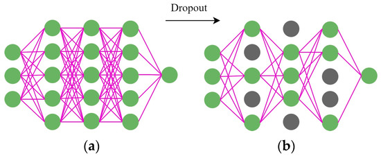 As shown in Figure 5, Figure 5a shows the fully connected network, and Figure 5b shows the network after applying the dropout method. Dropout can solve the overfitting problem by ignoring feature detectors to reduce the complex relationships between neurons and force the neural network model to learn better features.