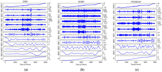 Taking the temperature time series at 0.5 m below the subgrade surface of the right shoulder of section K3588 + 100 as an example, the IMFs and R (residual) obtained by various decomposing methods of EMD, EEND, and CEEMDAN are shown in Figure 6, respectively.