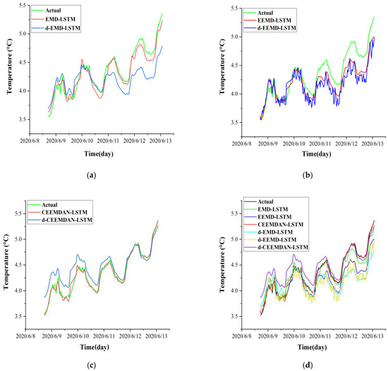 Comparison of prediction results of models with single dataset and hybrid dataset. (a) EMD-LSTM model (input hybrid dataset) versus d-EMD-LSTM model (input single dataset); (b) EEMD-LSTM model (input hybrid dataset) versus d-EMD-LSTM model (input single dataset); (c) CEEMDAN-LSTM model (input hybrid dataset) versus d-EMD-LSTM model (input single dataset); (d) Comparison of prediction results of all models.