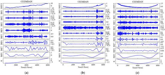 S(t) is the original time series, is the kth IMF obtained by CEEMDAN decomposition, represents the jth IMF obtained by EMD, is a scalar coefficient to set the signal-to-noise ratio at each stage, and thus, to determine the standard deviation of the Gaussian white noise, is the Gaussian white noise that meets the standard normal distribution. In this part of the calculation, , , , and represent a long vector of time series.