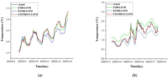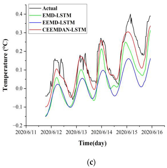 The temperature time series were processed by EMD, EEMD, and CEEMDAN, respectively, then reconstructed into a hybrid dataset that contains the volumetric water content time series (H) and frost heave time series (D) of the corresponding depths. After that, the hybrid dataset was put into the LSTM model training, to get the optimal model, and to then make predictions. The specific prediction results are shown in Figure 12.