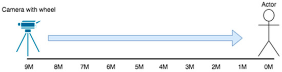 The recording started from 9 m and was slowly moved to 1 m before the person, as shown in Figure 1. Considering the completeness of the sampling data, we expected the manifestation of the persons that stand at the distance from 9 m to 1 m at the equivalent angle and the distance interval within 9 m. Therefore, all the distances are part of the training sample. For sampling quality consideration, the images used as the training sample were recorded at 60 frames per second (FPS60) with a resolution of 1080 pixels per inch (P1080). Therefore, the image data are constructed in Figure 2.