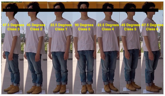 Regarding the image classification in the experiment, the influences of person rotation on distance estimation were emphasized. Therefore, the image classification was improved based on the method used by Yu [30]. First, we divided the person’s front side into seven rotation angles and tagged the data about the image of each of the angles (Figure 4). Then, we arranged the persons to be detected so they were aligned at the corresponding angle with an angle to minimize personal judgment systematically.