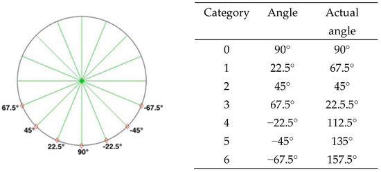 In most cases, it is impossible to know the angle at which the person in an image or photo faces the lens. In real life, the azimuth the person faces cannot wholly coincide with the estimated amount in the image. To quantify the angle of each of the photos as far as possible, we classified the predicted angles of the person into seven categories, which were at an interval of 22.5 degrees, as shown in Equation (8). Specifically, is the possibility that the person is at a rotation angle.